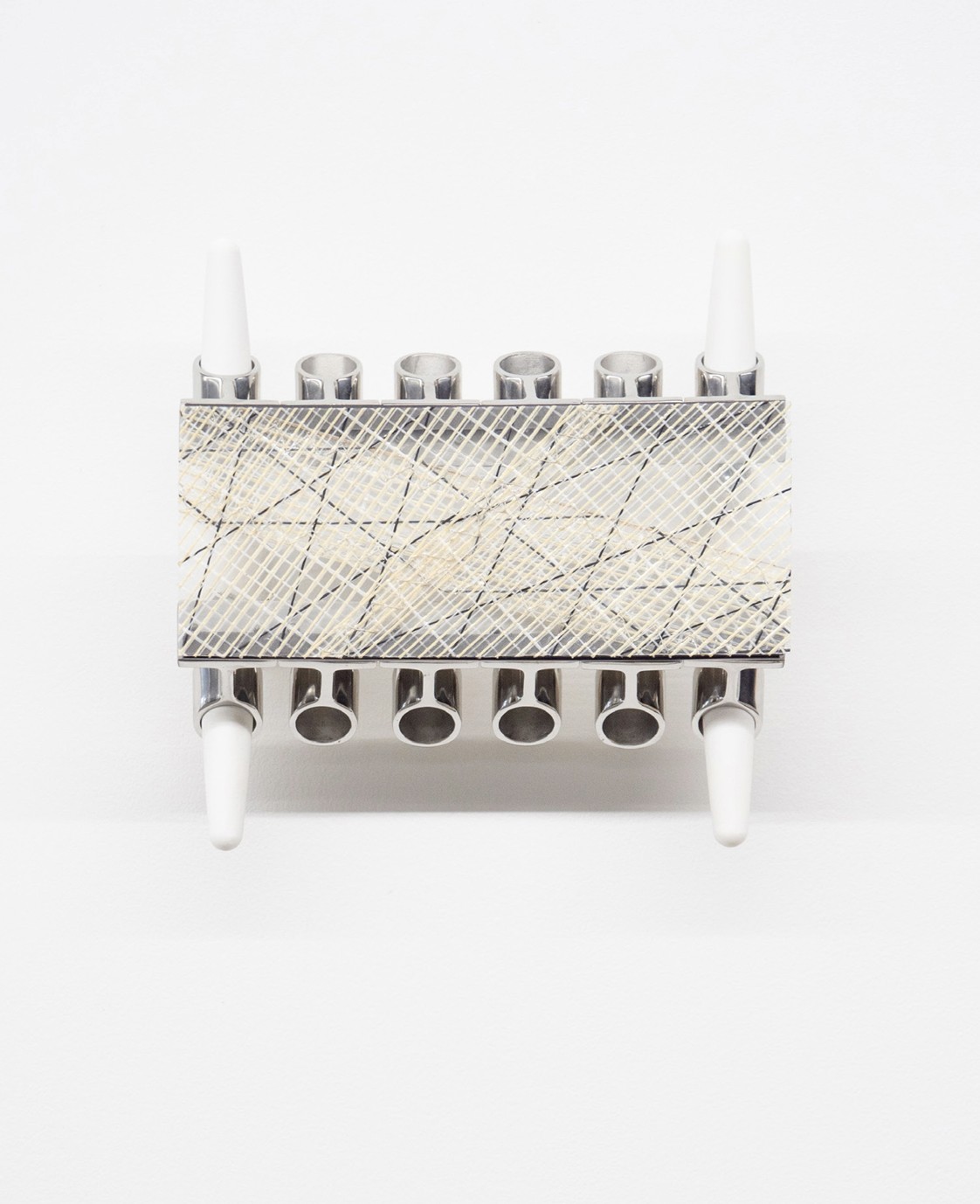 Recycled carbon fibres from former airplane parts as canvas and recycled paraffin wax as paint. Aluminium artist frame