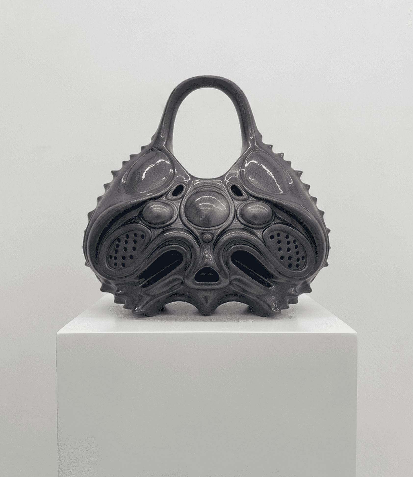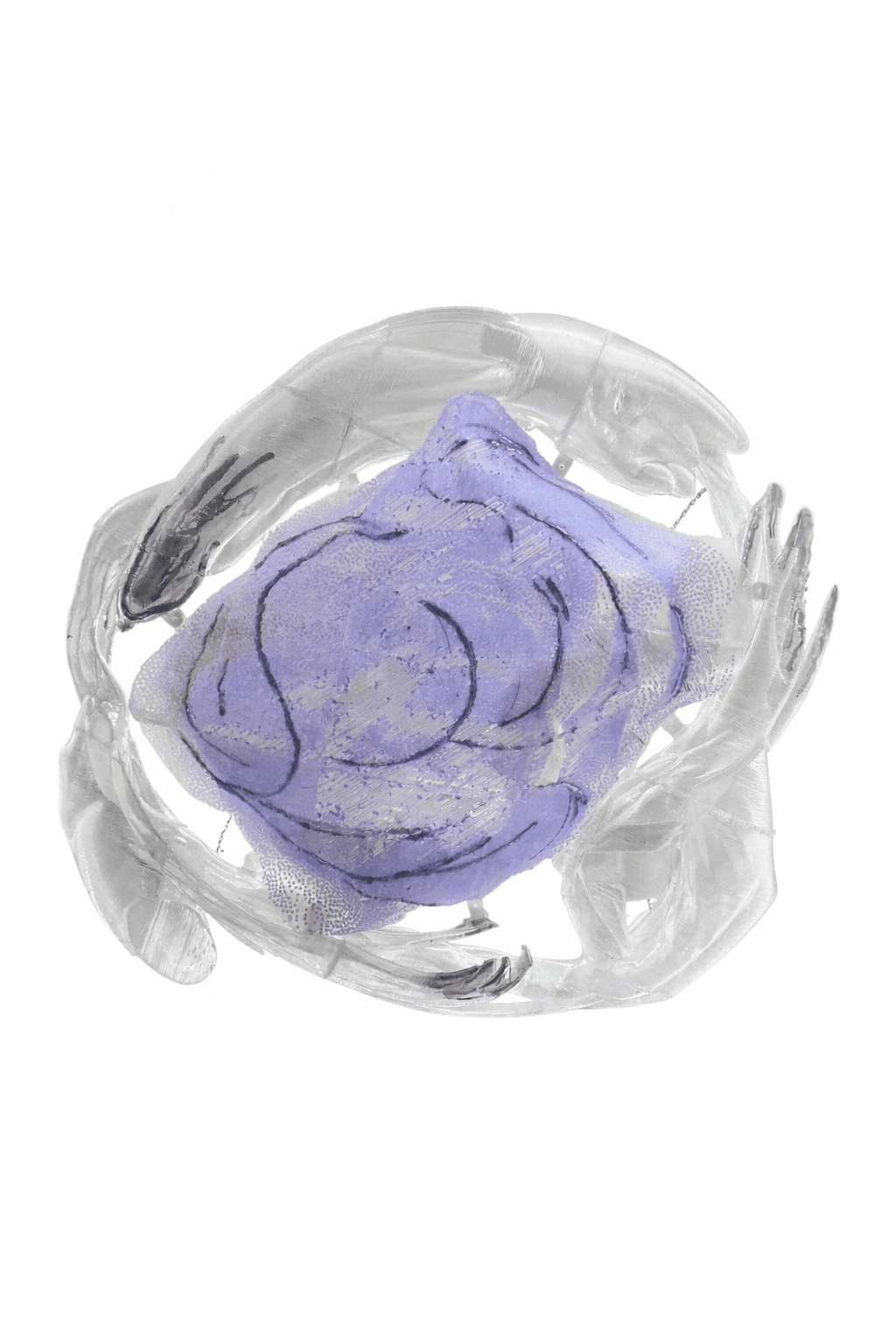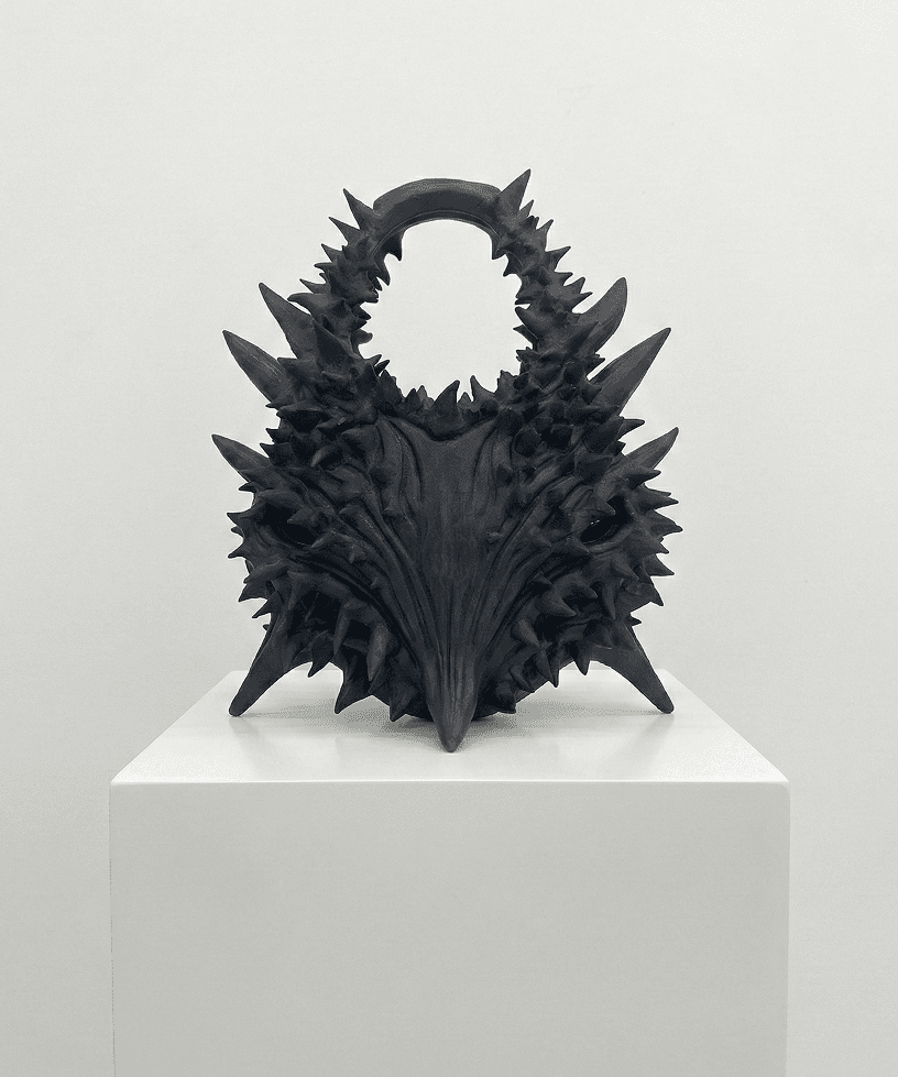 Fragment of a damaged carbon fibre and kevlar sail, boat cleats 3D printed with recycled ocean plastic, altered stainless steel boat fittings for- merly used in the installation BAIT.