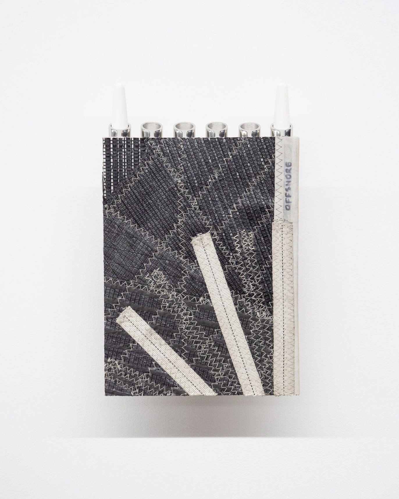 Fragment of a damaged carbon fibre and kevlar sail, boat cleats 3D printed with recycled ocean plastic, altered stainless steel boat fittings formerly used in the installation BAIT.