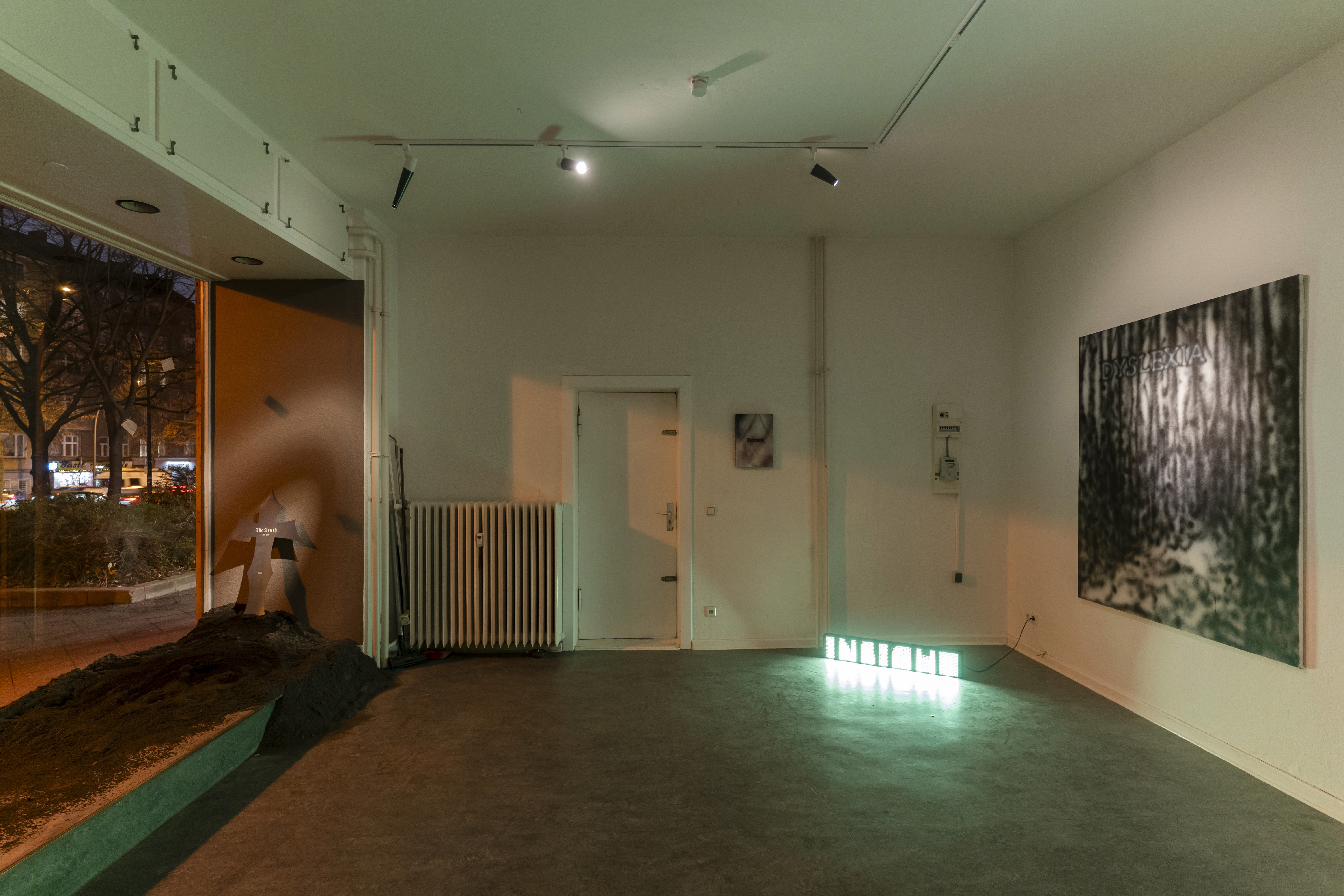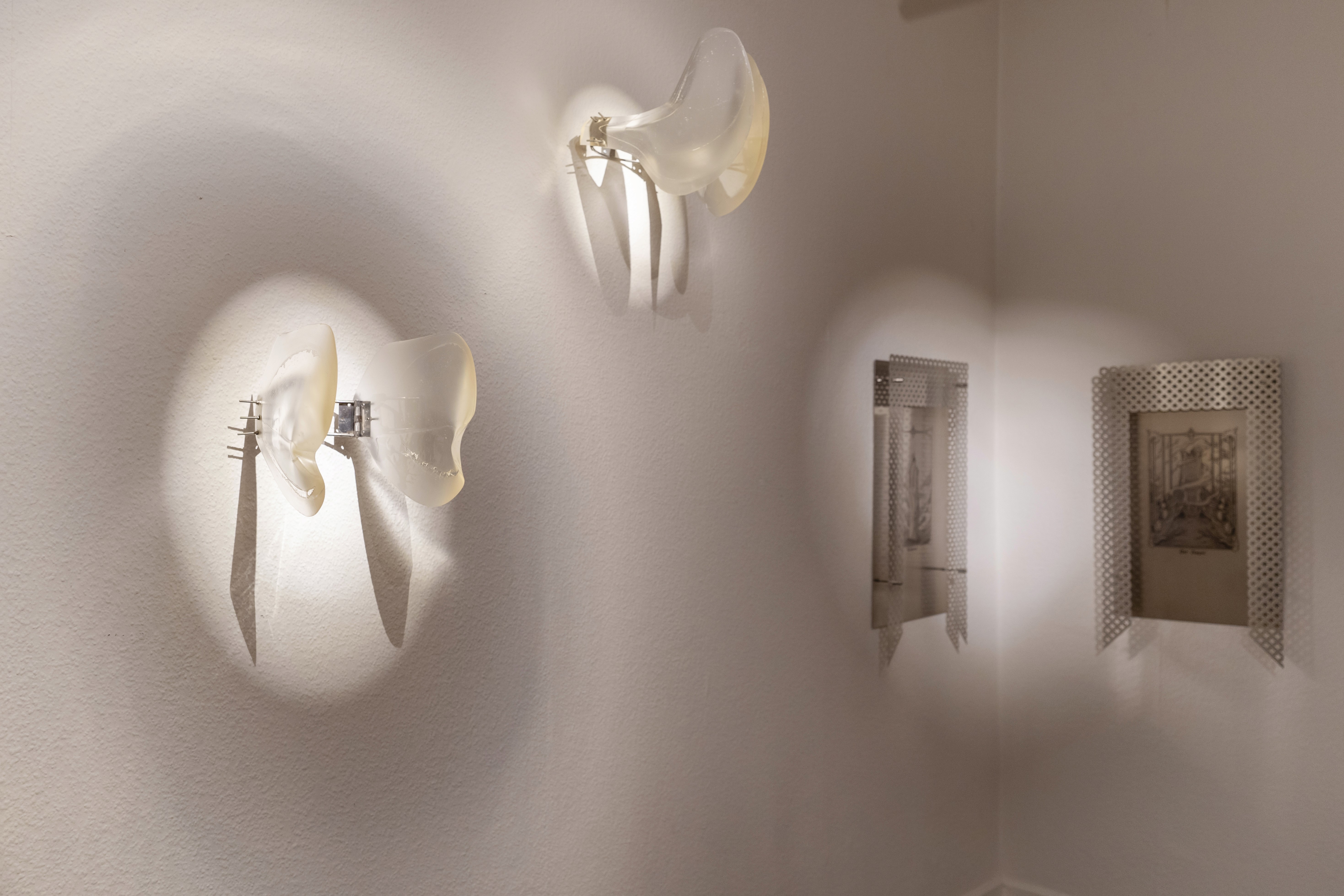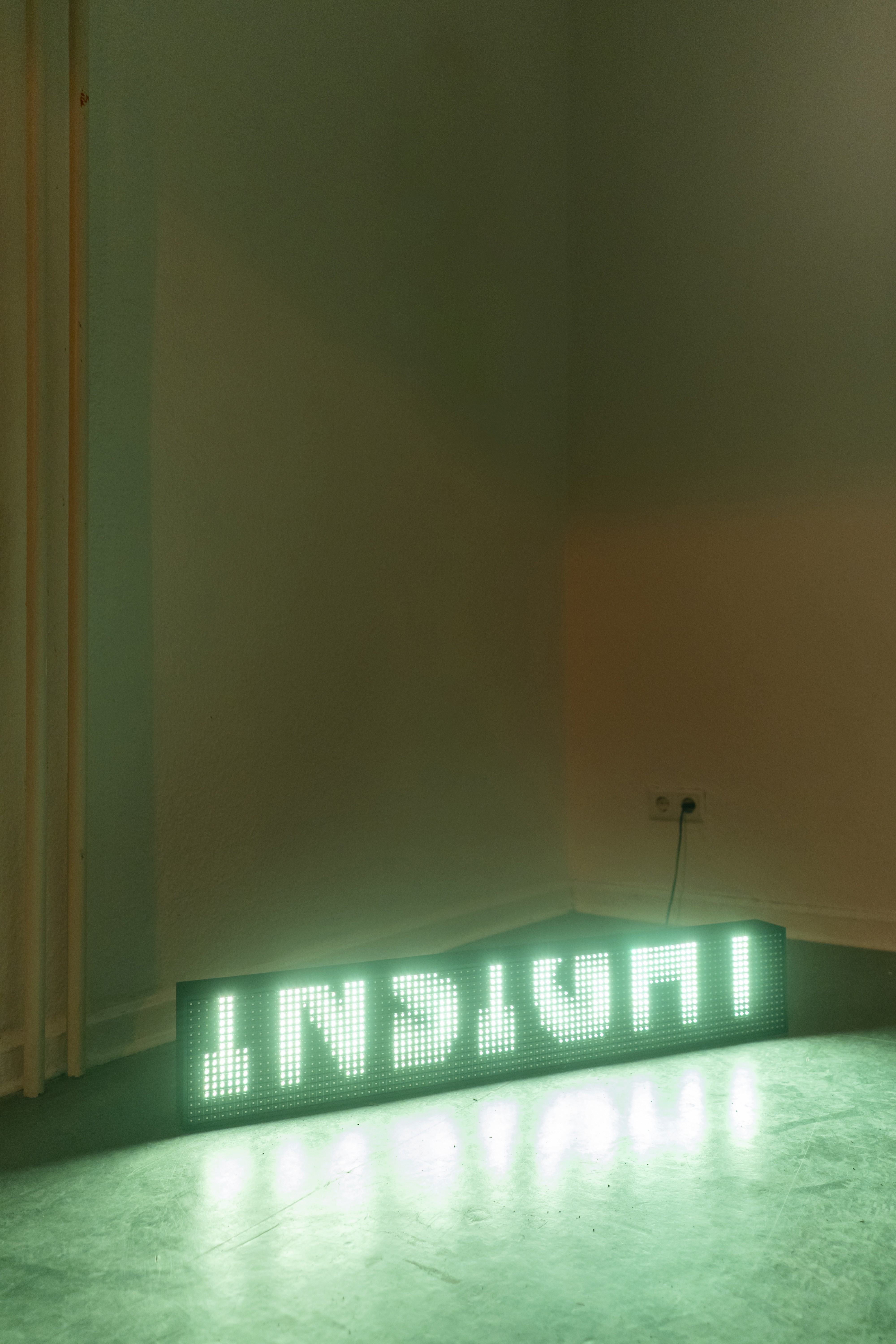 How do we manage to minimize the dizzying flow of constant information and external stimuli to an extent that we can think clearly? The artist Hannah Hallermann gives shape to the question wether the continual adjustment of our field of awareness has become an indispensable skill for our time. Her ADJUSTERS invite you to come closer, physically engage by placing your head inside, close your eyes, and, for a moment, silence external noises and triggers. Her work raises the question of how much information do we actually want to expose ourselves to? At times it seems essential to protect ourselves from all outside influences and preconceived opinions in order to create space for our very own independent thoughts and ideas. Hallermann’s INSIGHT refers to the constant flow of digital information. The flickering lettering vanishes as soon as we try to read it, reflecting on the ephemerality of digital culture and our diminishing attention span. Only when we keep looking, the bright lighting imprints on our lenses and brains. Hallermanns works offer us space to reflect on possible mechanisms to free ourselves from the nebula of irritating stimuli and fleeting digital statements.