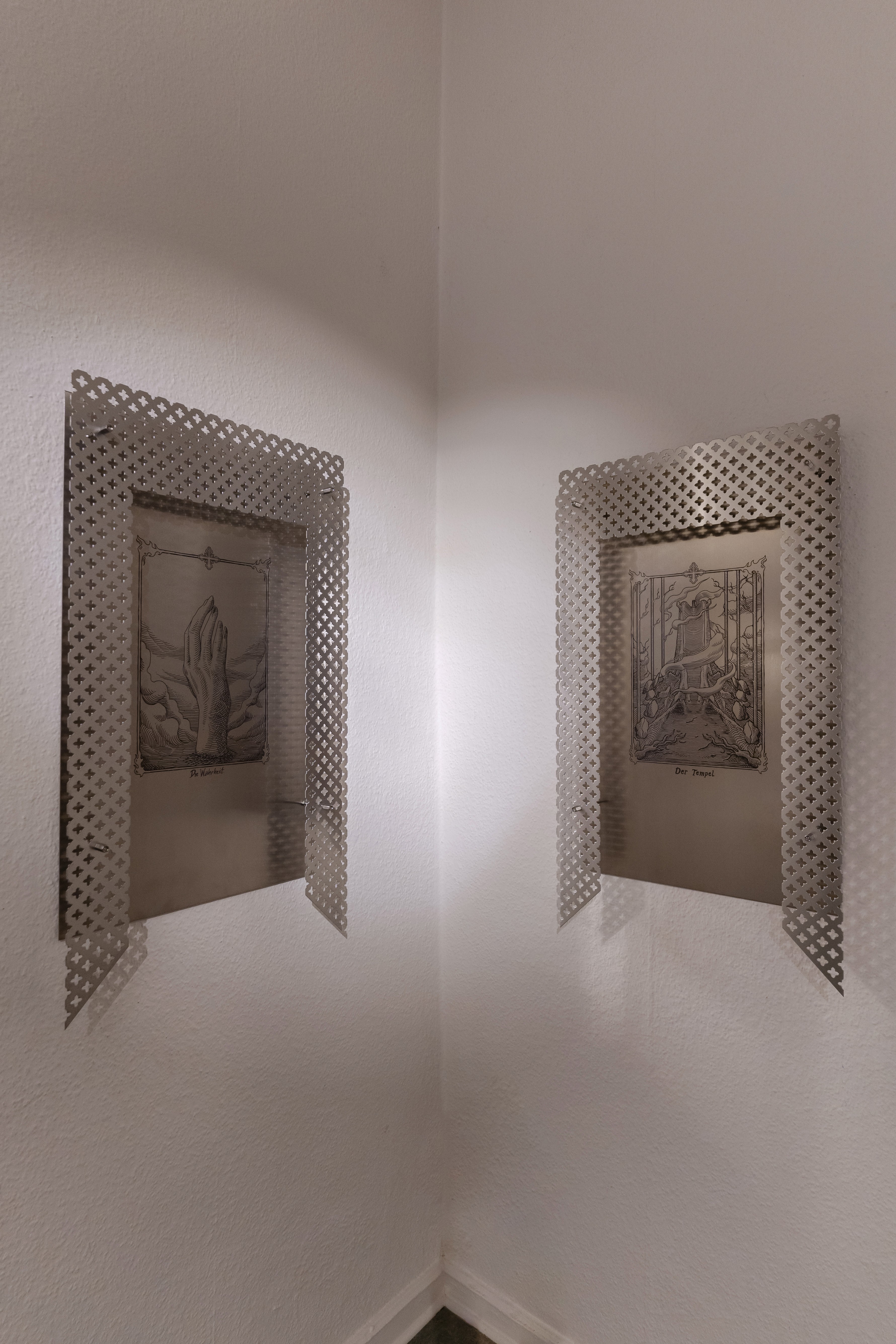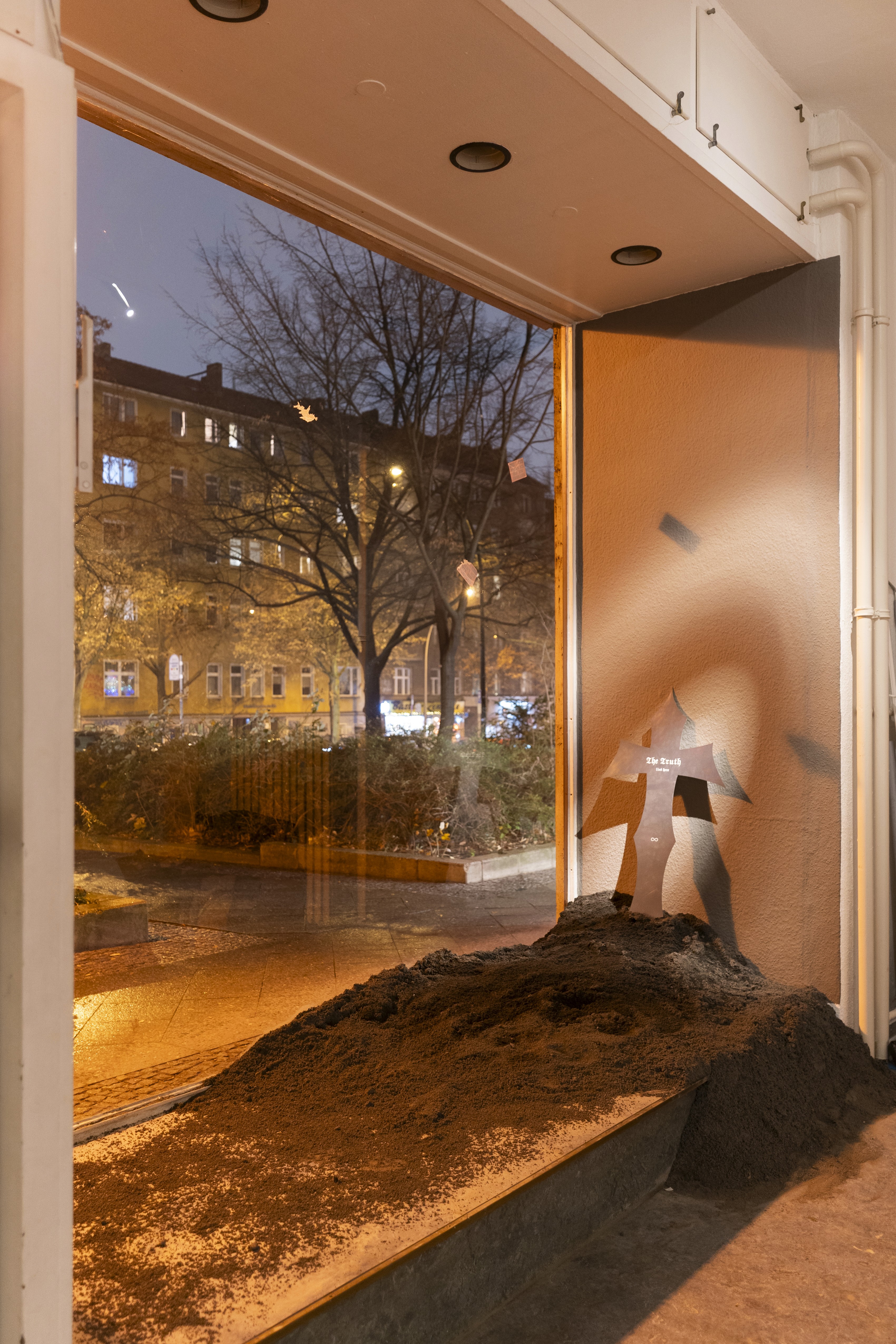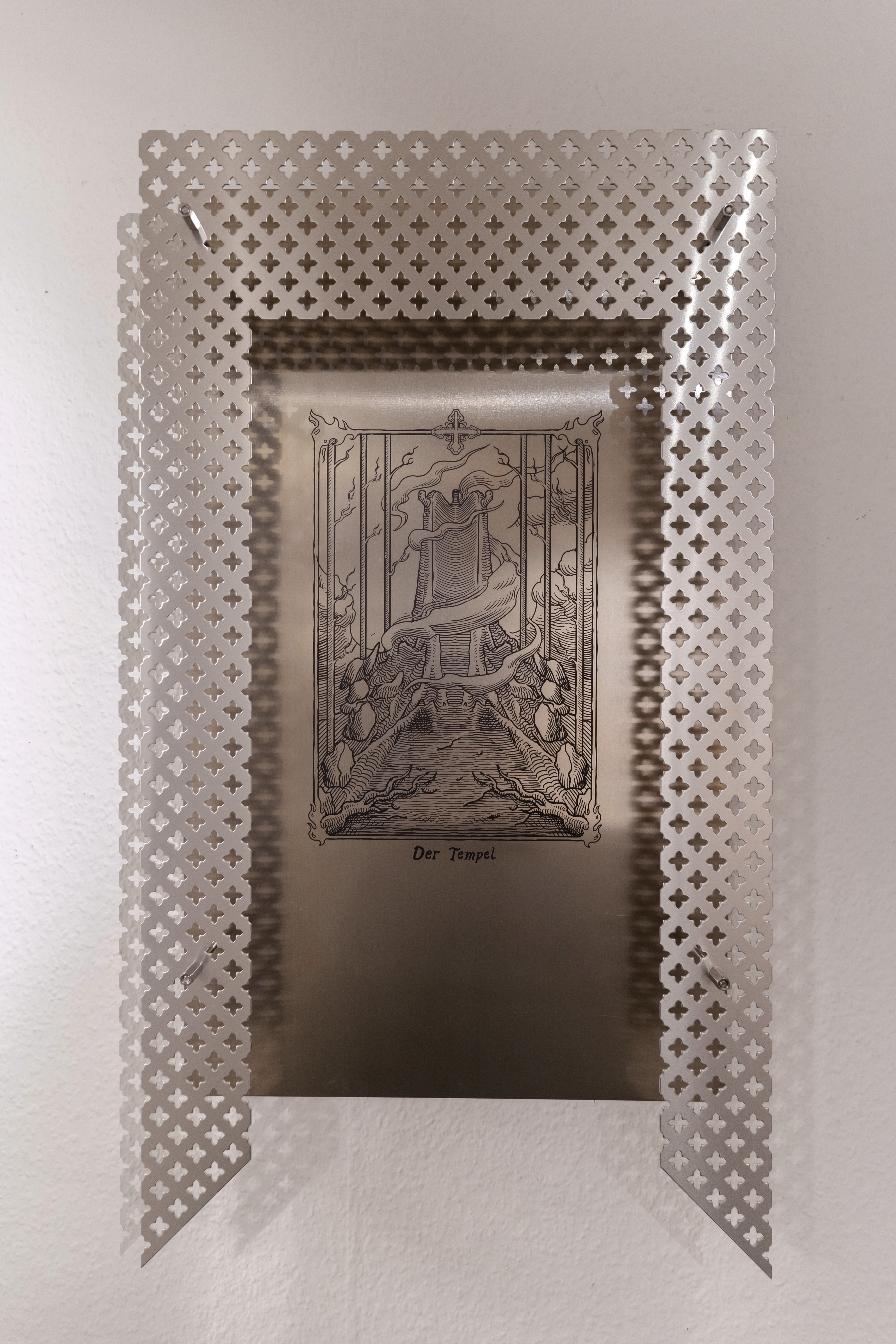 The artist Emma Adler explores the complexity of conspiratorial concepts – both in terms of religious dogma and political propaganda – and populism in her works VERITAS VERMIBUS (the truth lies here), The Deceit and The Temple. Her multimedia work, evokes a sense of eeriness and desertion, symbolizing the burial of truth – visualized by a steel cross that is dug in a heap of black sand, endlessly abandoned. The digital flood of images and information on the internet is increasingly being exploited by entities, such as the right-wing party AfD, for political propaganda and the dissemination of disinformation. In the end, we, as consumers of digital culture, are increasingly unaware of the truthfulness of images, as they often depict a distorted reality. The sheer mass of information, images, and dogmatic opinions increasingly restricts our ability to freely form our own opinions and beliefs and to (re-)gain autonomy. The truth sinks deeper and deeper into the black sand, slowly dissolves in the fog.