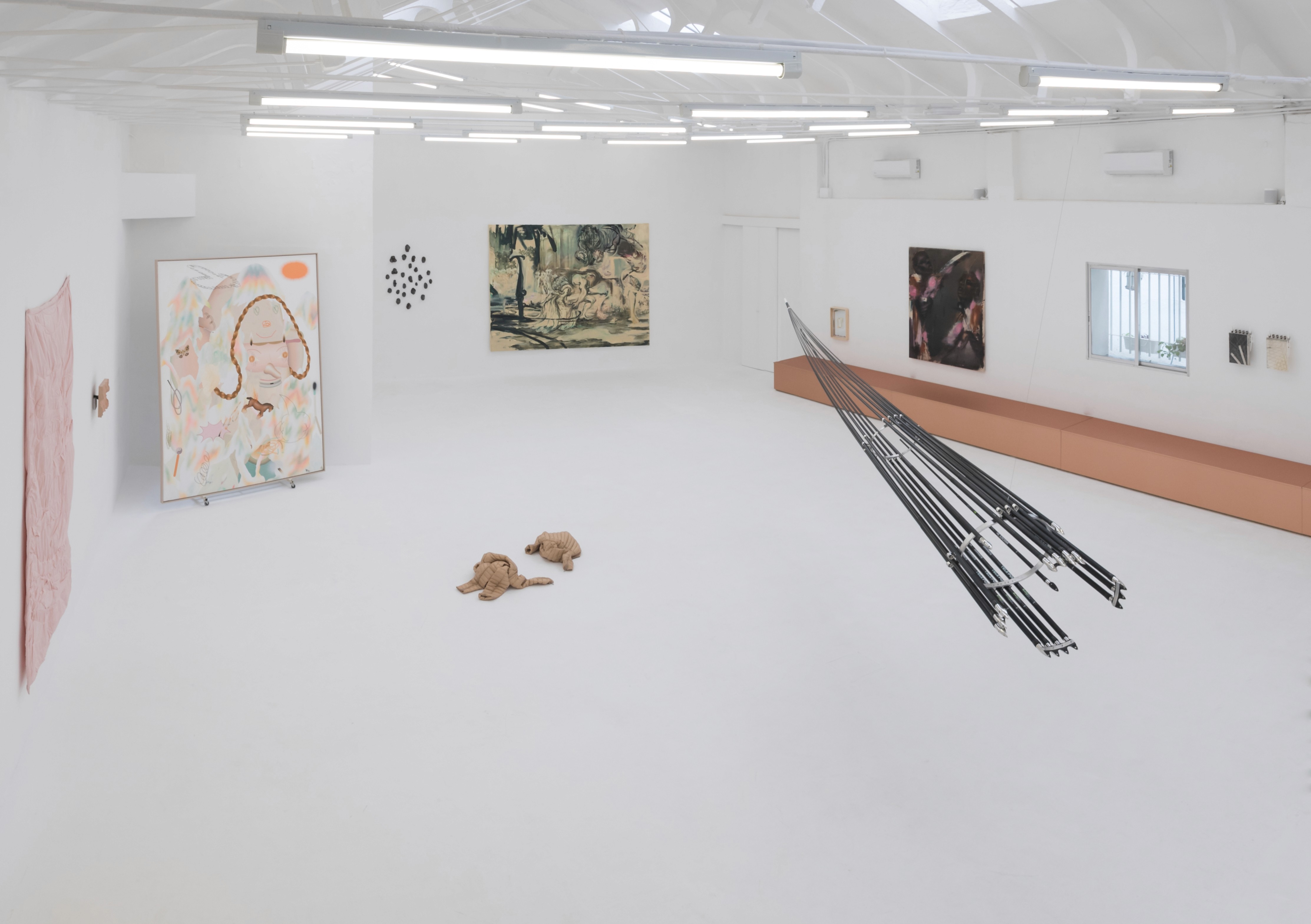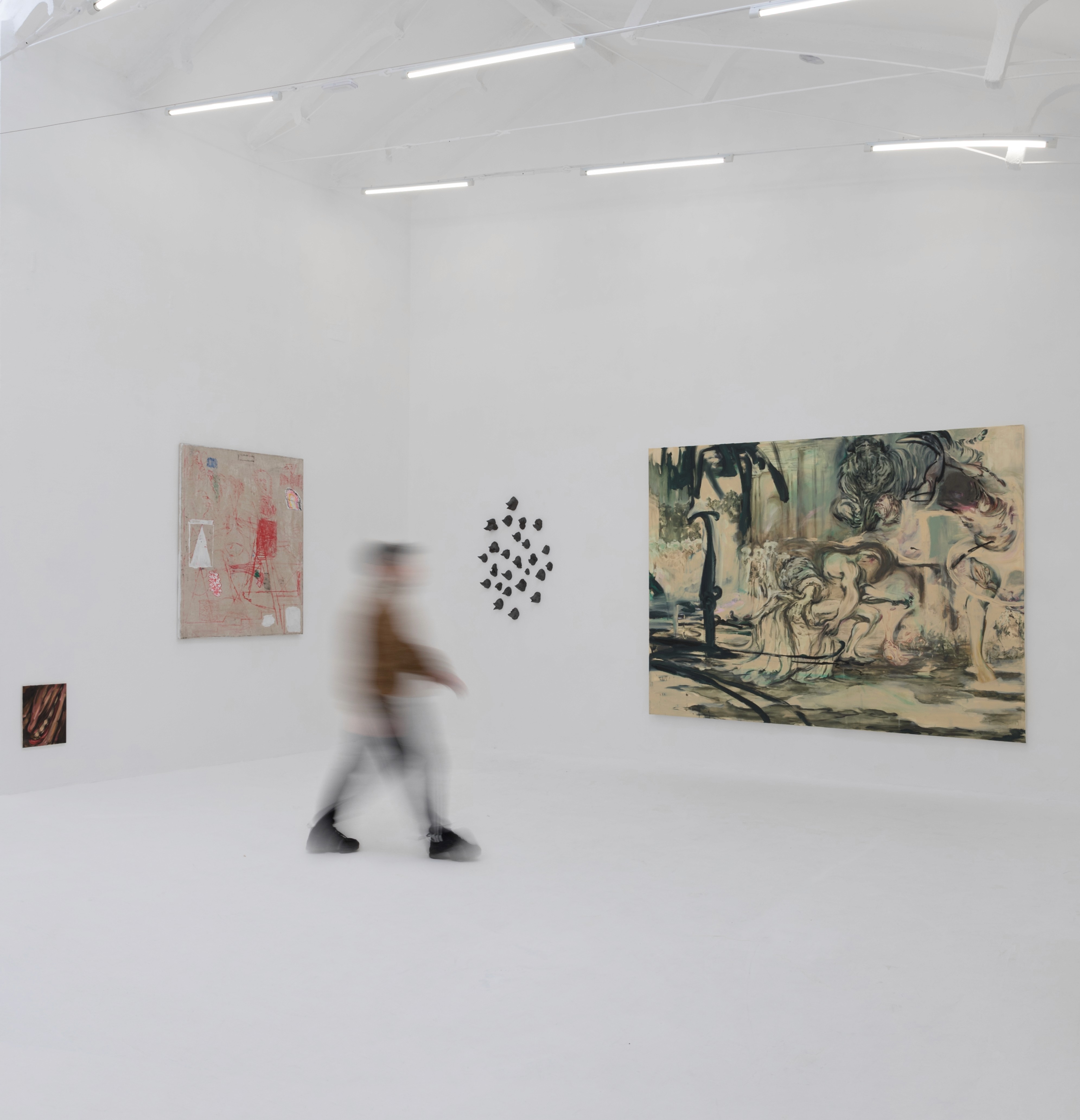 Las pinturas de Jan Vallverdú y Marcus Nelson exploran la tensión entre lo primitivo y lo fugaz. Nelson emplea la boca como símbolo del impulso primario —reír, morder, gritar, besar— en pinceladas gestuales que oscilan entre orden y caos; Vallverdú abraza la inestabilidad de la forma al permitir que el cuerpo se derrame más allá de sus límites.