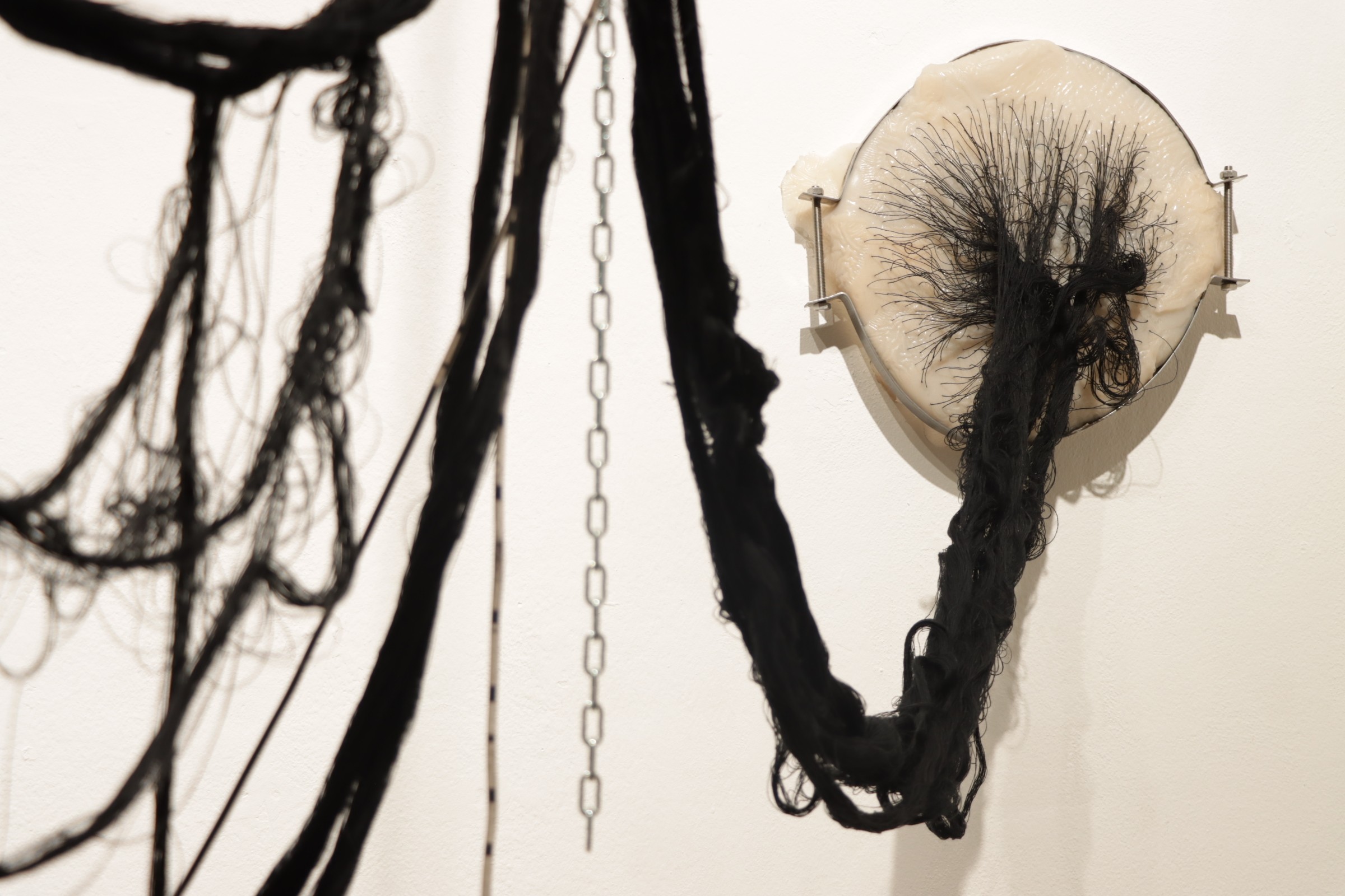 Threads unveil the interconnected nature of vessels. They create autonomous forms of inter webbed expression of their own, inhabiting these bodies as reminders of our condition of entities in flux; yet, carrying information that is ancestral and has been programmed before us: fluidity, viscosity, and transparency, as inevitable conditions of the self’s decay.