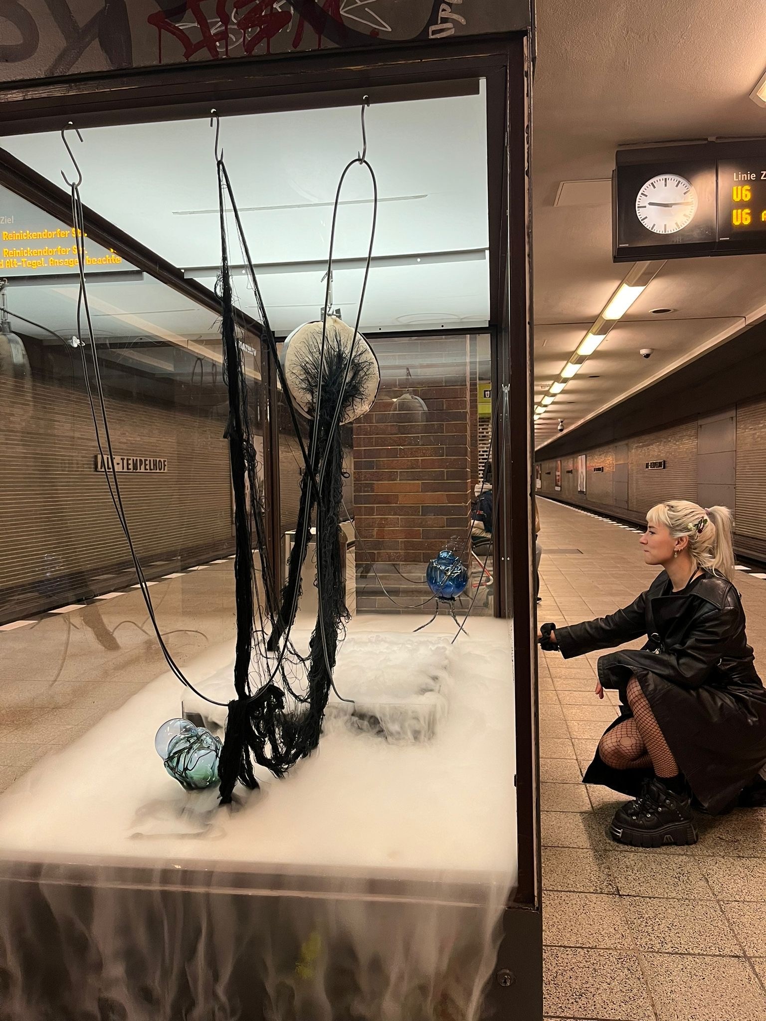 Over the course of 30 days, this synthetic organism of cyclical nature will coexist within the urban life inside the U-Bahn station, pumping and expulsing dark liquids through its prosthetically designed arteries.