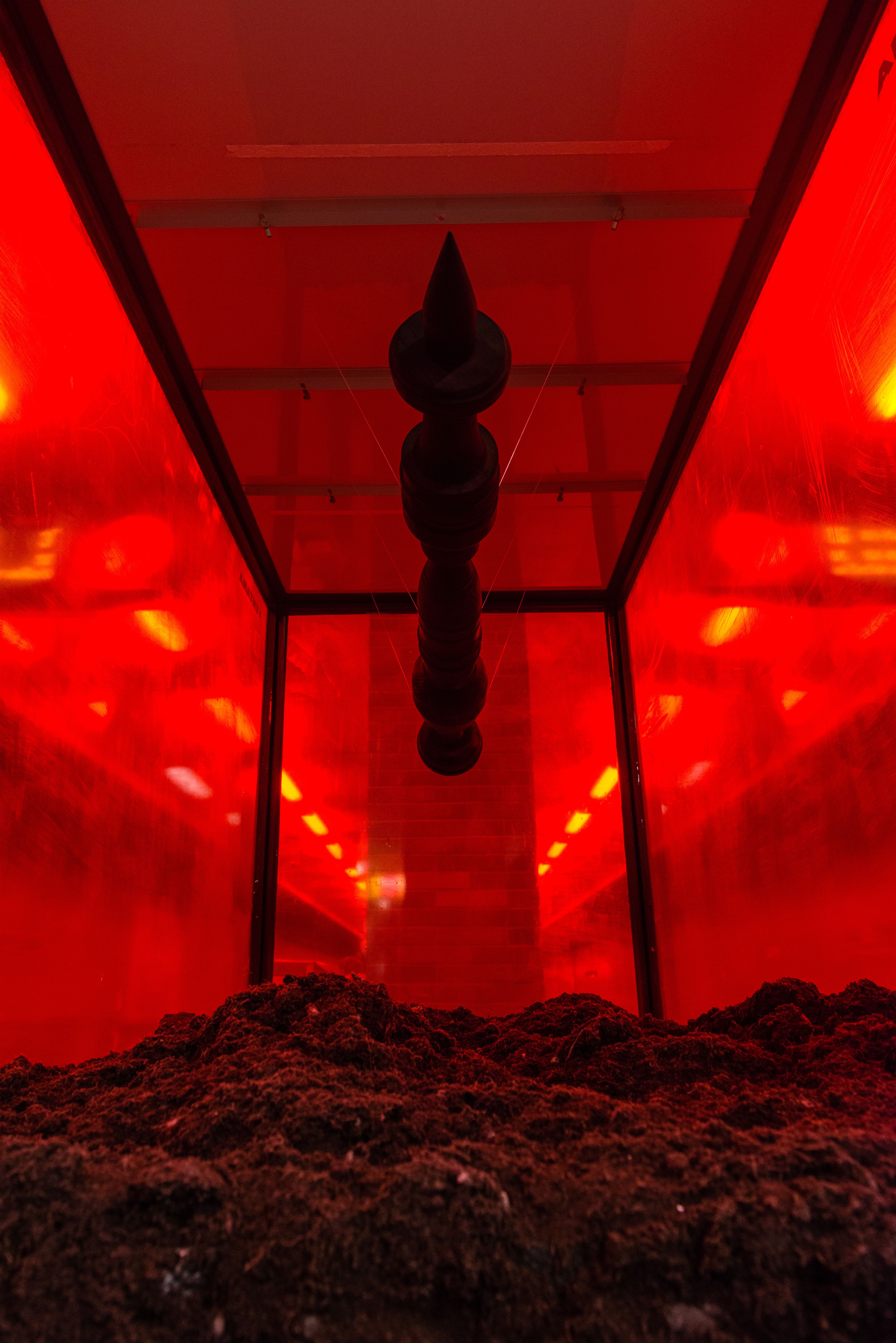 At its core, the installation features a burnt wood sculpture meticulously crafted to mimic a nuclear weapons totem pole, placed on a substrate of charcoal-laden earth that reveals echoes of a cryptic past or an enigmatic future. Jarrin strategically employs this juxtaposition to enhance the imagery of war, presenting a formidable artifact seemingly suspended in a dense crimson sea.